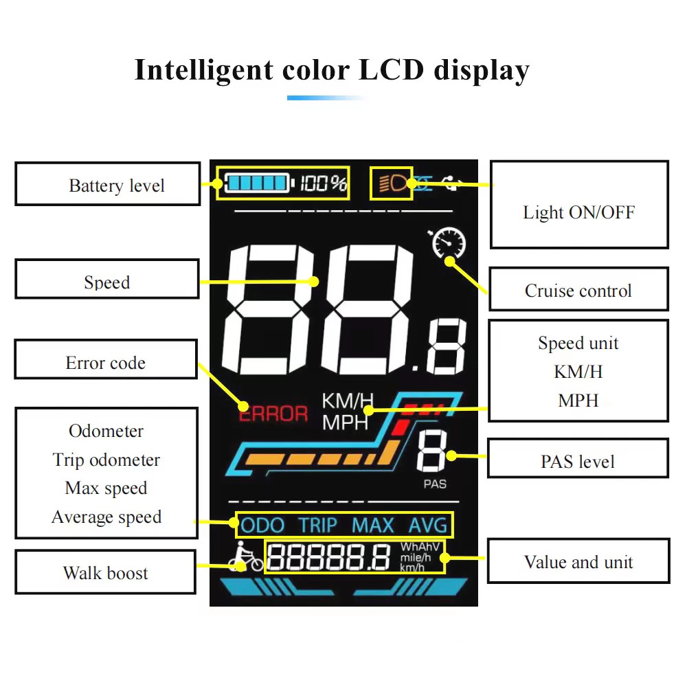 As to speed display, it includes real-time speed “RT SPEED”, “MAX SPEED”, average speed “AVG SPEED”, and Km/h or mile/h. The new color display can be set according to customer habits.