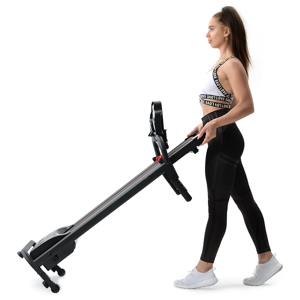 The folding design makes the treadmill easy to store in the corner of the room to save space. Built-in transport wheels facilitate movement from one room to another. This treadmill is perfect for small apartments.